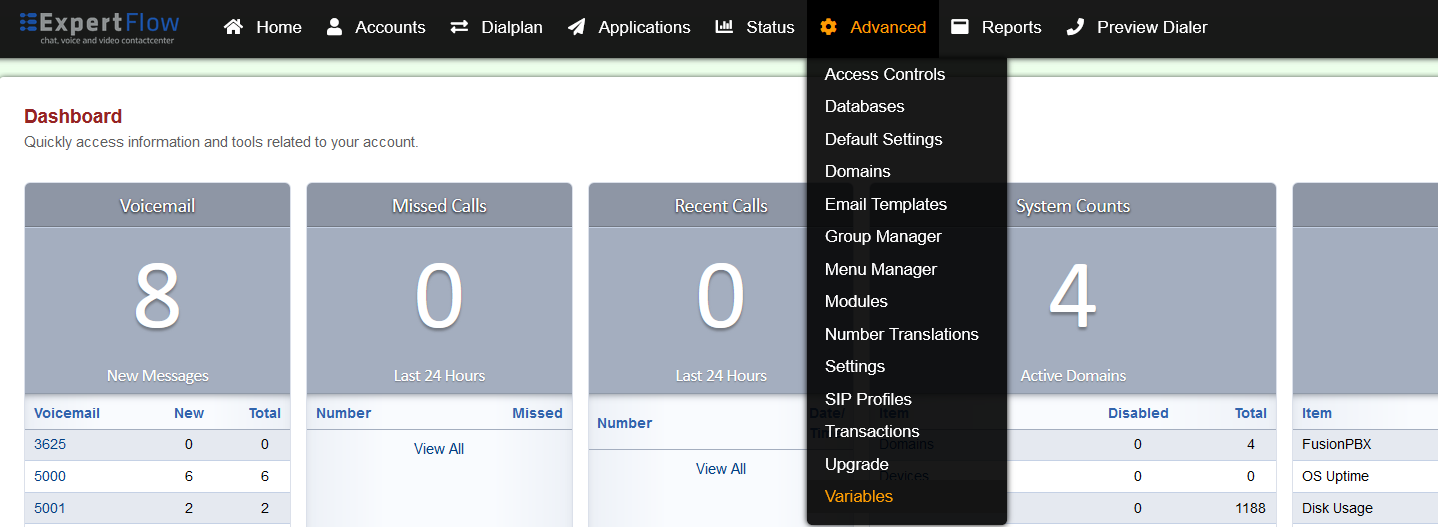 • Select the Variables option from the Advanced tab.