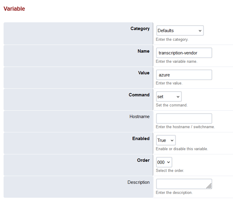 • Set the Category to Defaults, Name to transcription-vendor and Value to azure.
