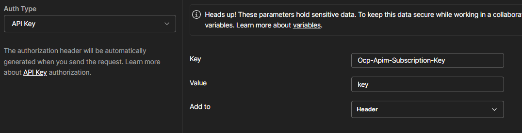 • For the following APIs, use Authentication type API Key, with the Key name set to Ocp-Apim-Subscription-Key , Value set to the Subscription Key above, and the key added to the request headers.