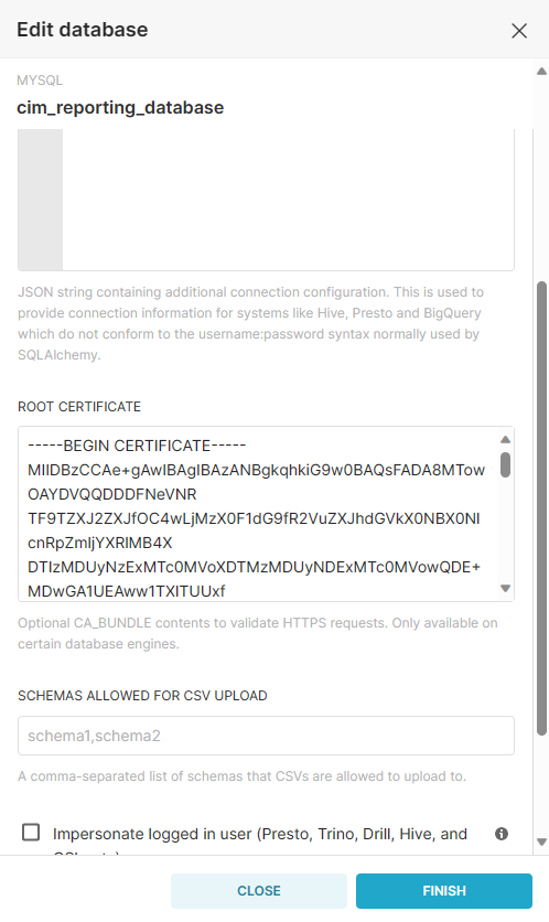 Login into Superset as admin then go to the Database Connection from the Settings and edit the Database Connection next go to the Advance Tab and paste the copied MySQL certificate text into the Root Certificate and click on Finish.
