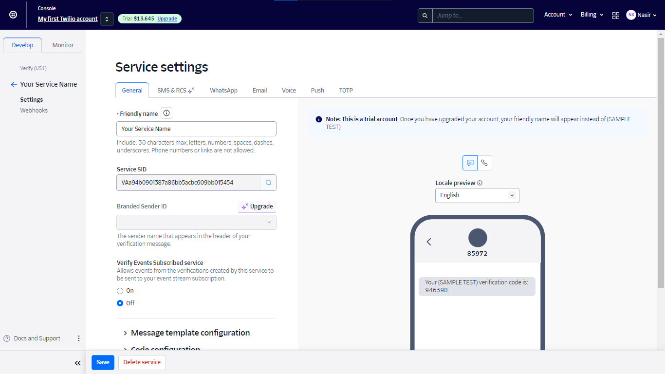Copy ‘Service SID’, visible under Friendly name, and save it along with Account SID and Auth Token.