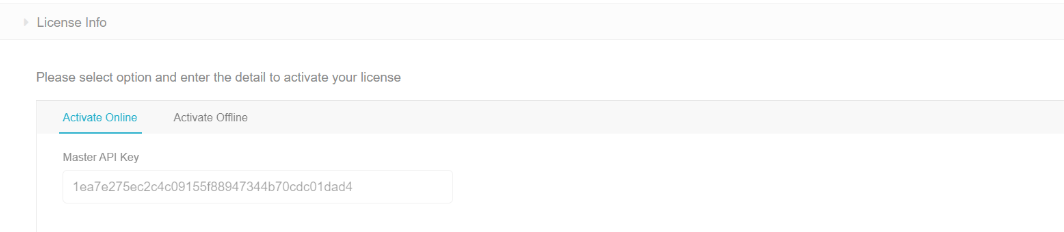 On General → License Info, enter the license key, also known as, the Master API key received from the Expertflow shop in the Master API Key field under the Activate Online tab, and click Save.
