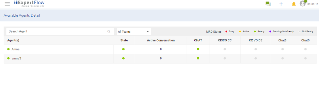 In the active agents detail dashboard the agent will be able to view all the agent of his team who are currently active including their state, no. of active conversations, and state of subscribed MRDs. While viewing the list of available agents with a count of active conversations, supervisors can also change an agent's state based on the agent's current state. This allows supervisors to manage long-idle agents and maintains workflow efficiency.