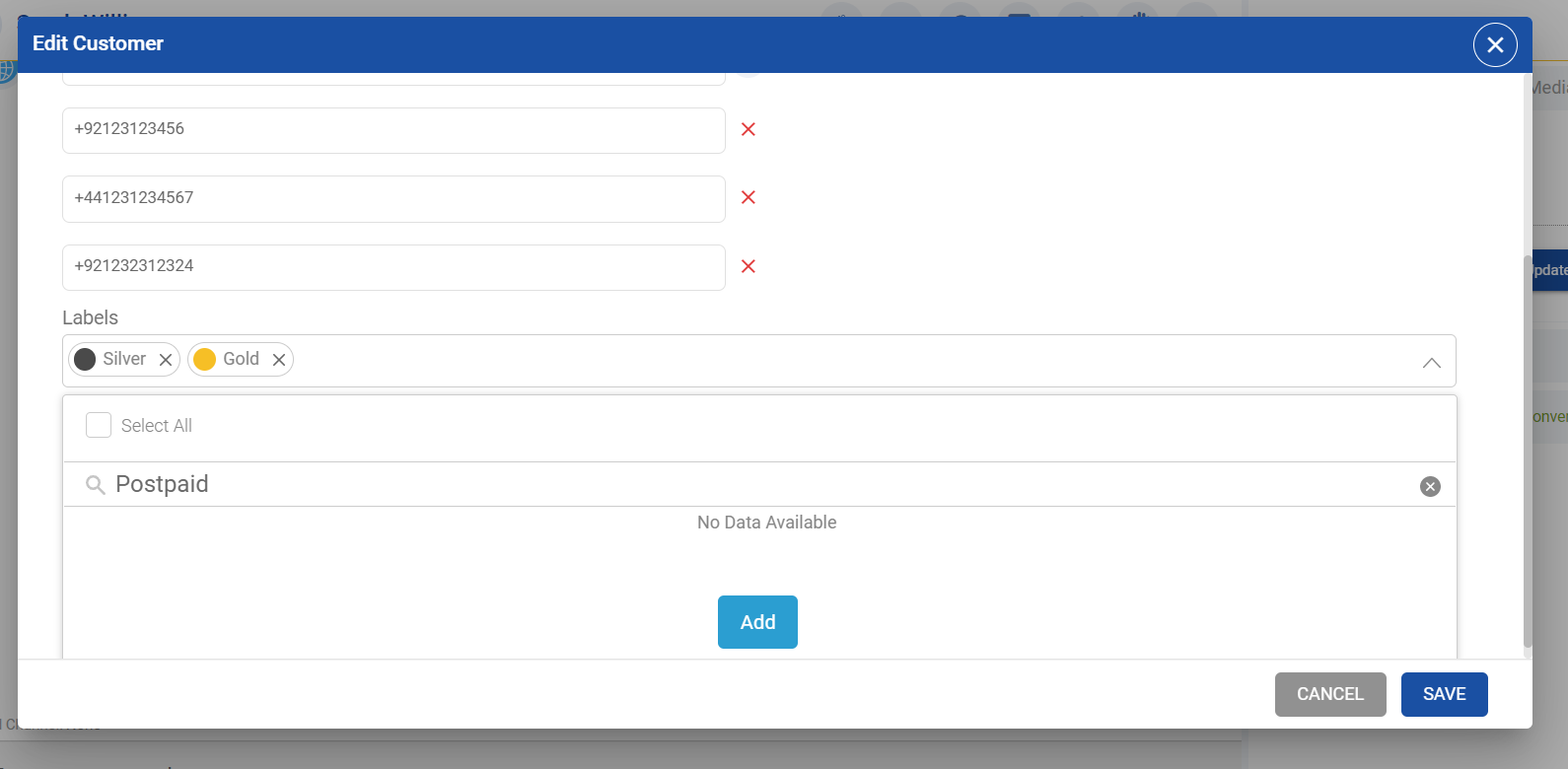 In the Labels dropdown, the agent types the name of the label he is looking for or chooses the ones from the list. If the label does not exist, click the Add button in the result set to add a new label with the specified string with a default label color grey. Click the Save button to save all the changes made.