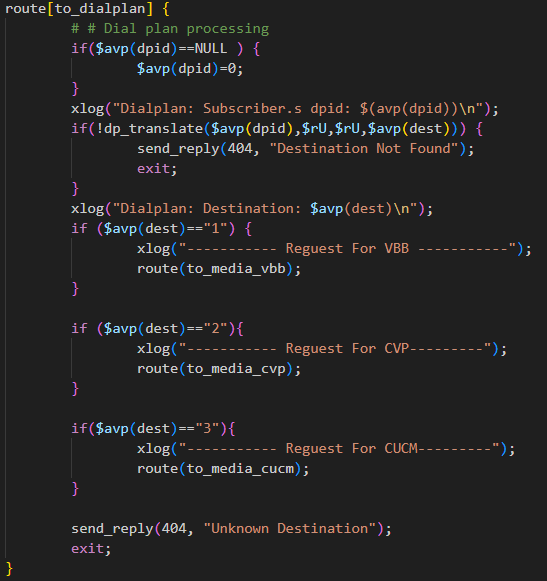 CODE# Route for dialplan processing route[to_dialplan] { # Initialize dialplan ID AVP if not set if($avp(dpid)==NULL ) { $avp(dpid)=0; } xlog("Dialplan: Subscriber.s dpid: $(avp(dpid))\n"); # Translate destination using dialplan if(!dp_translate($avp(dpid),$rU,$rU,$avp(dest))) { send_reply(404, "Destination Not Found"); exit; } xlog("Dialplan: Destination: $avp(dest)\n"); # Route request based on destination if ($avp(dest)=="1") { xlog("----------- Reguest For VBB -----------"); route(to_media_vbb); } if ($avp(dest)=="2"){ xlog("----------- Reguest For CVP---------"); # request with no Username in RURI route(to_media_cvp); } send_reply(404, "Unknown Destination"); exit; }Save this file and restart opensips.