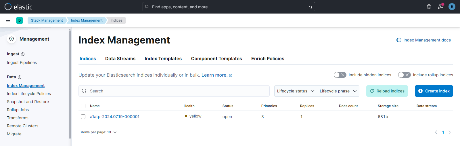 Head over to Stack Management from the burger menu and open Index Management. There you will see the index that you have created in Step 5. Output will be as below:-