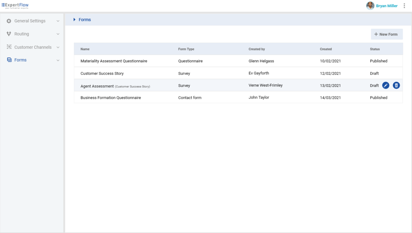 The forms can be used to create survey questionnaire for customers to provide feedback, pre-chat forms asking the website visitor to provide some information before starting the chat, agent guidance scripts with questions and predefined answers for agents' assistance, quality questionnaire for supervisors to rate agents' performance. Other examples include, creation of a callback form for customers to leave a callback request, product/service subscription to register/ subscribe to new service, etc.