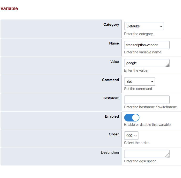 Set the Category to Defaults, Name to transcription-vendor and Value to google.