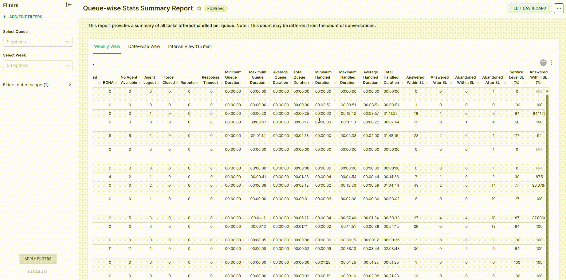 - Queue - select the name of the queue(s) you want to see the data for. This filter is applicable to view all three tabs of the report; i.e. Weekly View, Day-wise View, Interval View.