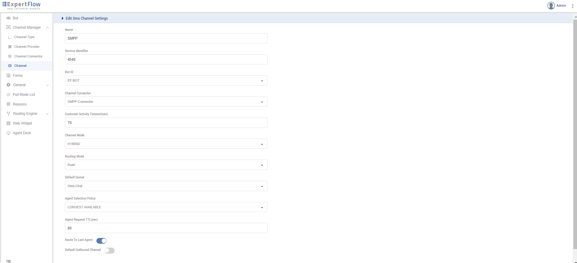Supported Channel Types will be selected as "SMS" (If you want to setup any one only, then select any one).