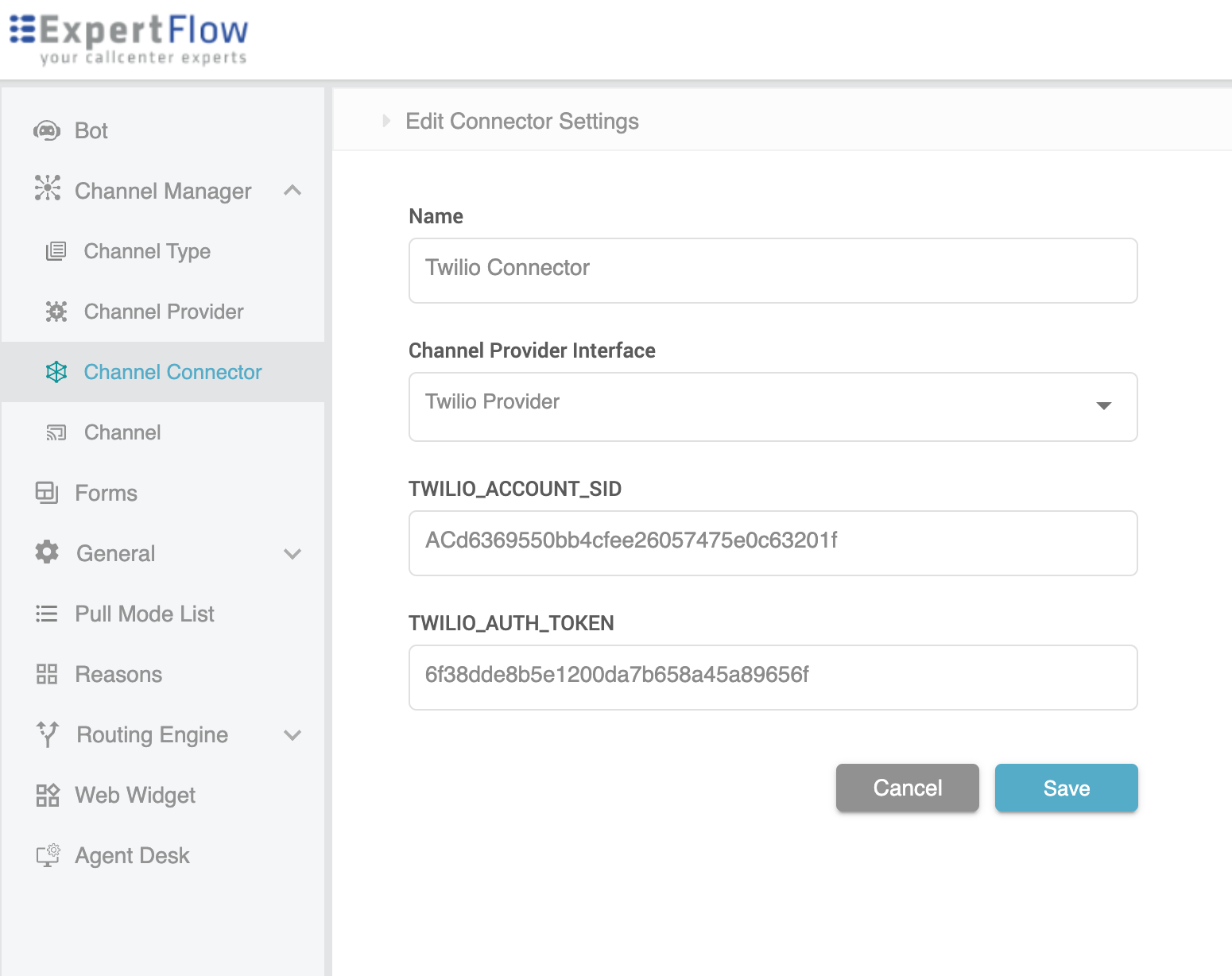 Provide the service name of Whatsapp Connector in the Provider Webhook field as http://{SERVICE-NAME}:{SERVICE-PORT}. Replace the {SERVICE-NAME} and {SERVICE-PORT} in the URL with component's k3s based service name and port (It can be fetched using k get svc -n expertflow) and it will be http://ef-twilio-connector-svc:8085