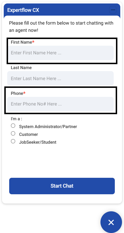 Ensure you have at least one required field in the pre-chat form, such as 'Phone' or 'Email'.