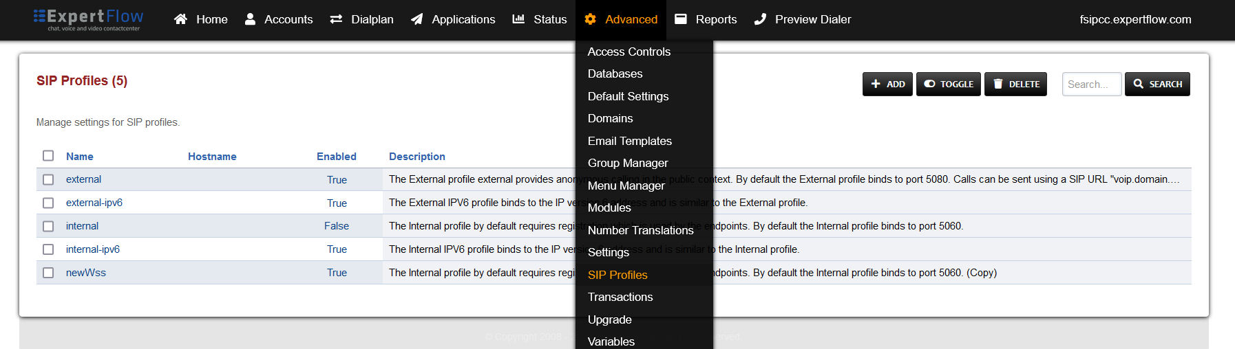 • Press the IP address in the top right and select the Domain created in the Domain creation section of the EFSwitch configuration document.