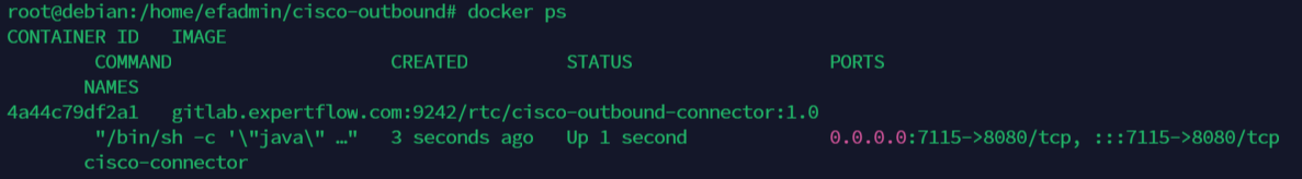 CODEversion: "3" services: cisco-connector: image: gitimages.expertflow.com/rtc/cisco-outbound-connector:TAG container_name: cisco-connector ports: - PORT:8080 env_file: - docker-variables.env restart: alwaysReplace the 'TAG' keyword with the required image tag(Currently 1.0).