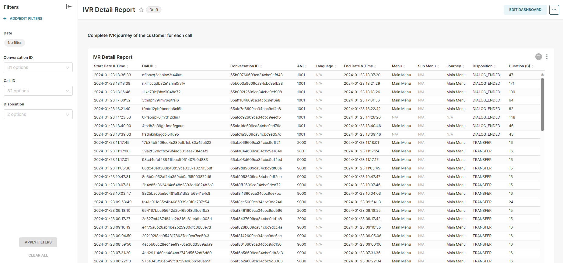 Journey | Shows the complete journey of the customer menu selection on IVR. eg. main menu, sub-menu, sales,etc. | |