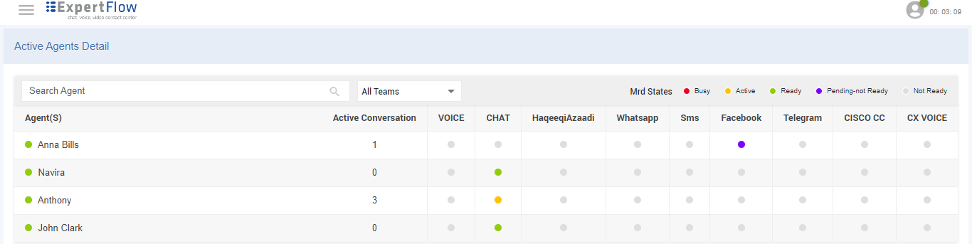 This dashboard shows the list of all agents with a count of active conversations with each agent based on the selected team along with the current state of the agent in each MRD.