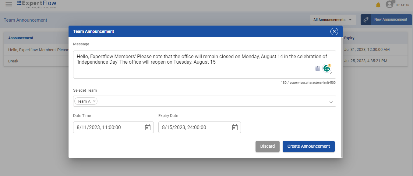 Supervisors can create, edit, and delete announcements for their team agents. Announcements are created for team agent(s) to notify the important news or information. Each agent/member of the team receives the announcement except the supervisor who has created the announcement.