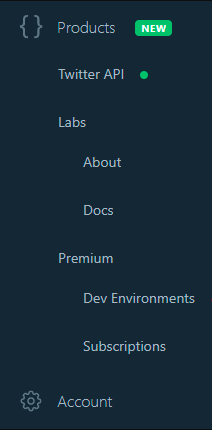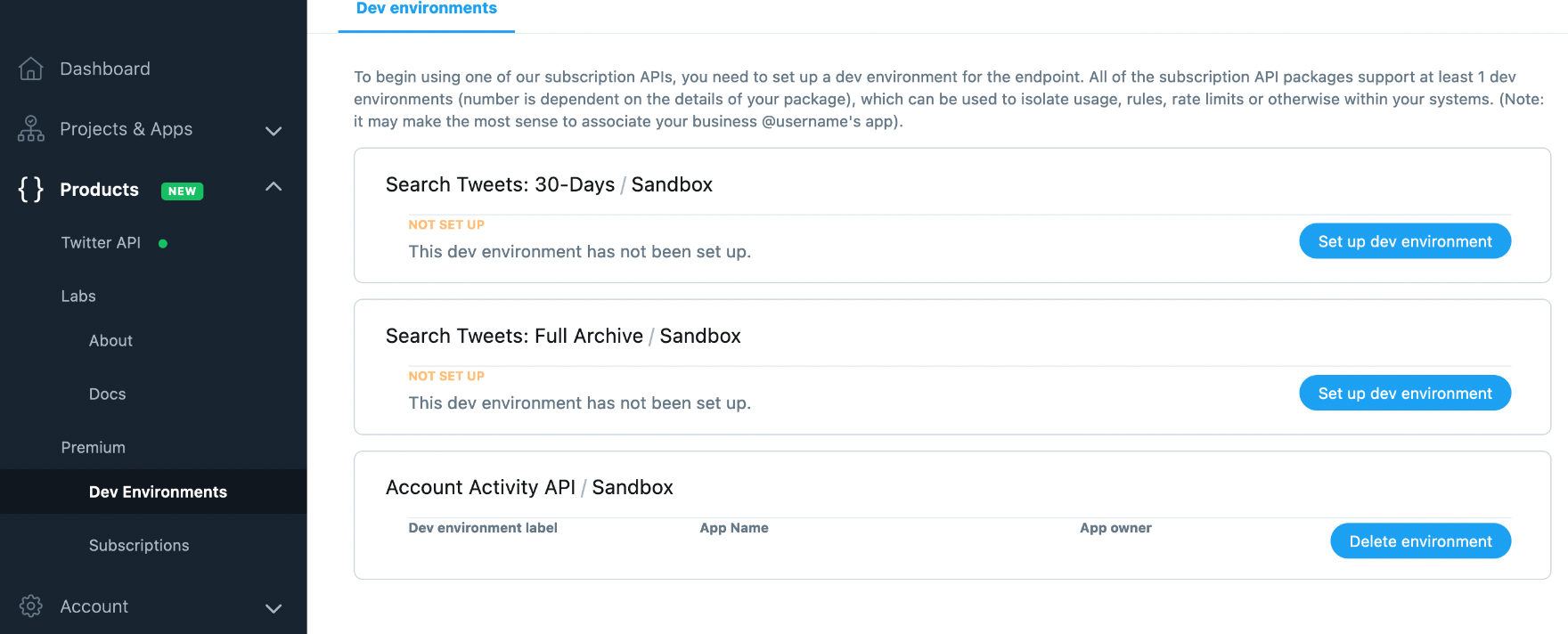 Next step would be to go to the "Products → Premium → Dev Environment" menu from the left navigation menu of Twitter Developer Portal and setup a "Lab Environment" (as shown in the screenshots below). Keep note of this environment name as well as you will be needing it while registering the CIM Twitter Webhook with Twitter. This environment is used for "Account Activity API" part, which will be sending events to the subscribed webhooks related to incoming/inbound data which could be tweets, direct messages and any other activity.