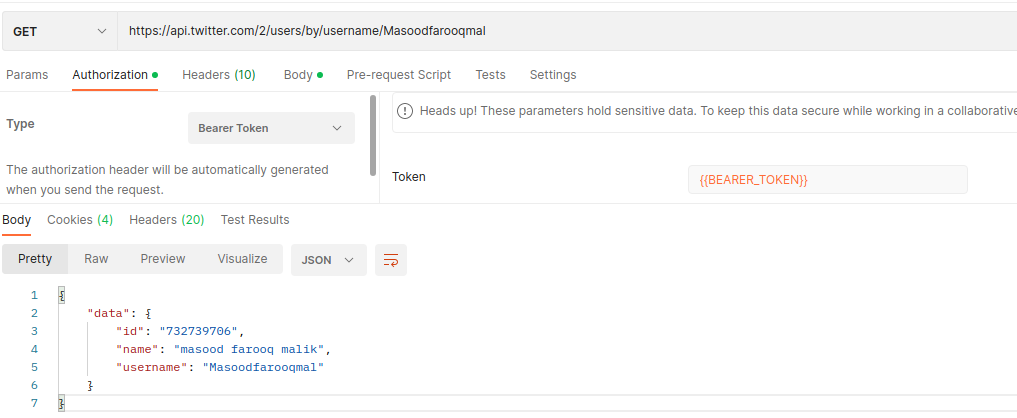 Header: Authorization - Type: "Bearer Token" (Provide Bearer Token extracted while generating API keys and tokens from Twitter Developer Portal)