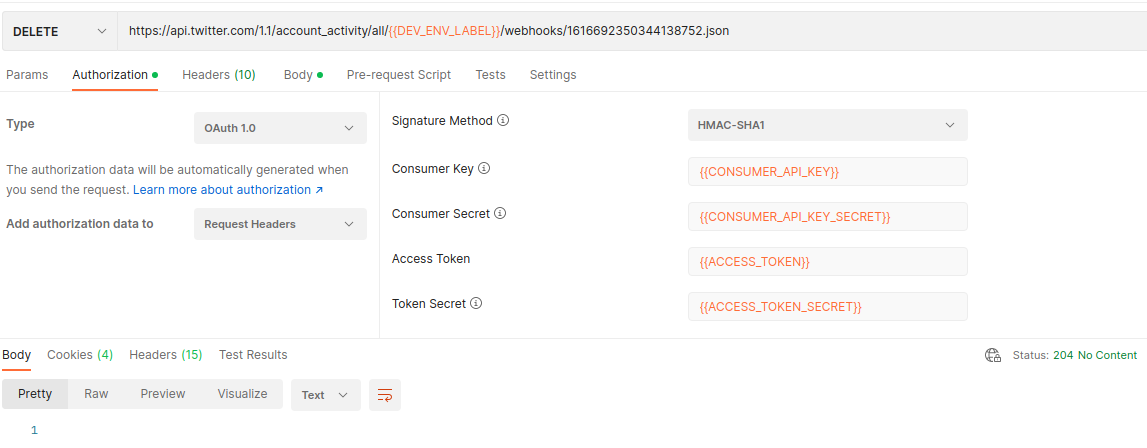 URL: DELETE https://api.twitter.com/1.1/account_activity/all/{{DEV_ENV_LABEL}}/webhooks/{{webhook_id}}.json (replace the