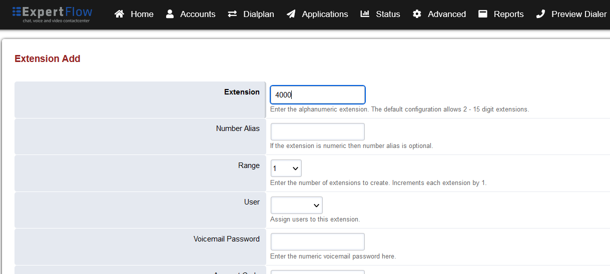 Add a number in the Extension field e.g. 4000.