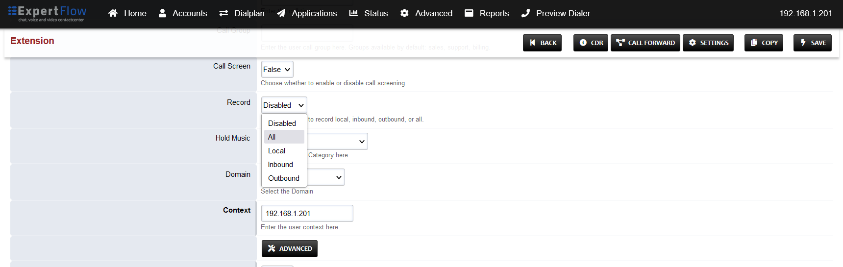 Also note the Call Timeout field, which is used to set how long calls will ring on this extension before timing out. Changing this affects the RONA (Re-route on no anwer) timer when using the extension with EF CX Voice agents.