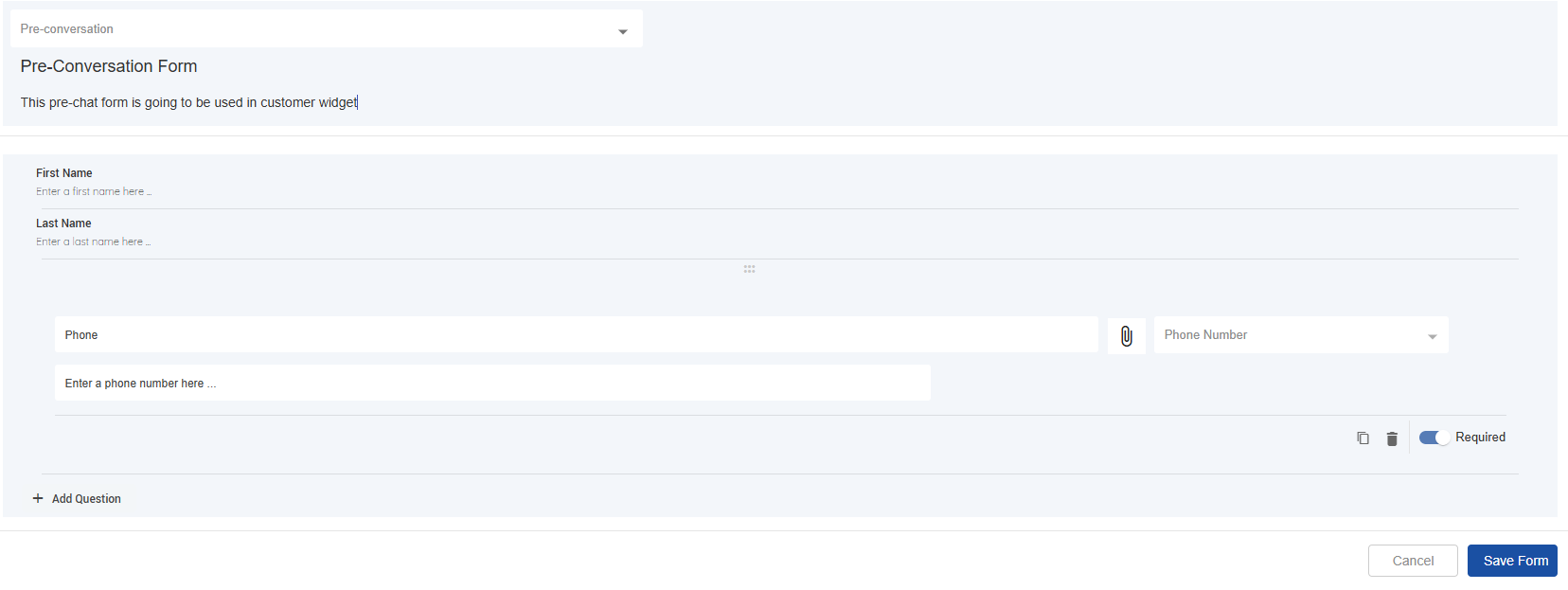 Once the pre-conversation form is created just select that form from the Customer Widget configuration setting to render it on the Customer Widget.