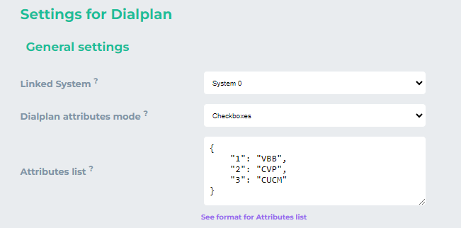 To add tool-specific settings via the setting panel, click the gear icon in the tool header. In the dialplan settings, modify the standard attributes for the dialplan by adding the following object to the “Attributes List” field: