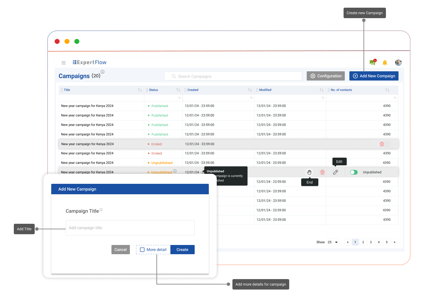 Campaign Actions Bar: Options to publish, unpublish, end, and edit a campaign.