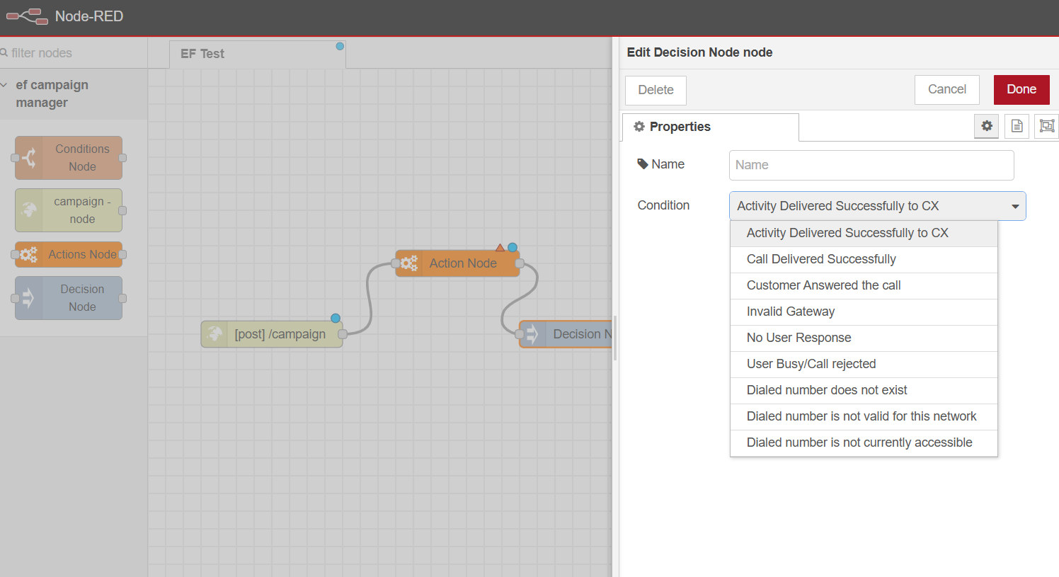 Decision Node: Allows the campaign builder in the conversation studio to decide what to do on any specific action response.