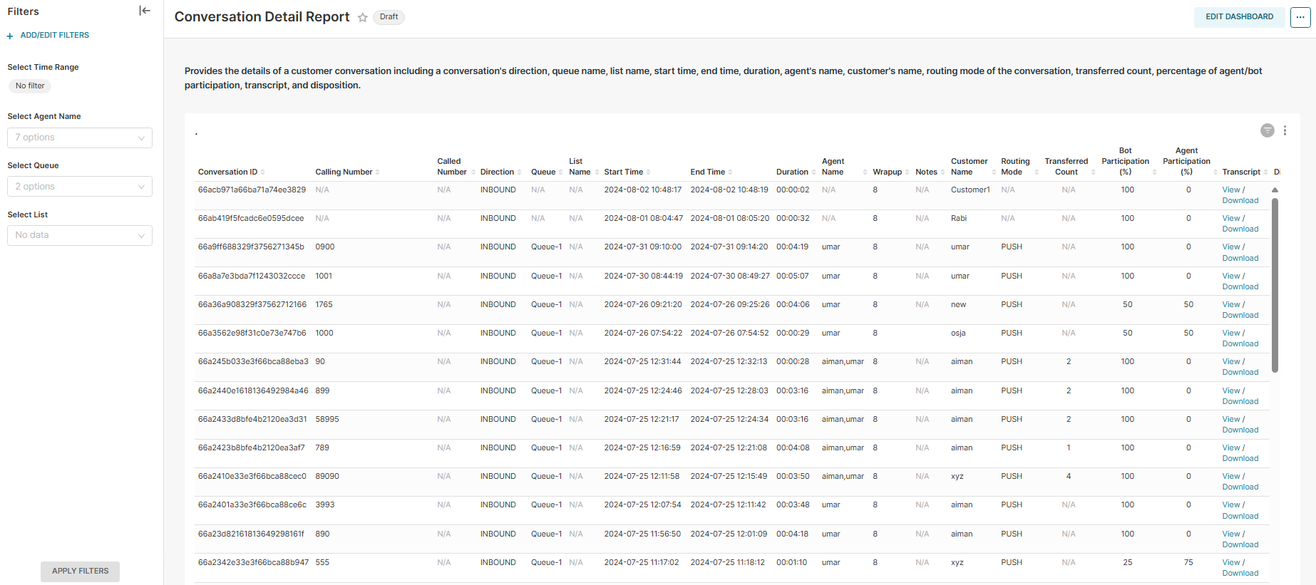 Report Summary | Provides the details of a customer conversation including a conversation's direction, queue name, list name, start time, end time, duration, agent's name, customer's name, routing mode of the conversation, transferred count, percentage of agent/bot participation, transcript, and disposition. |
