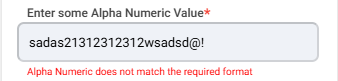 AlphaNumeric | Only alphabets and numbers are allowed. Spaces are also permitted. | {1 - 100} | ![]() |