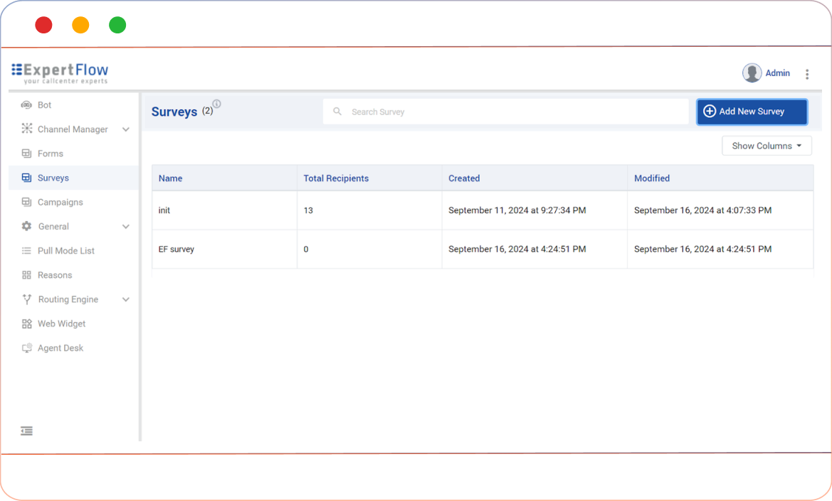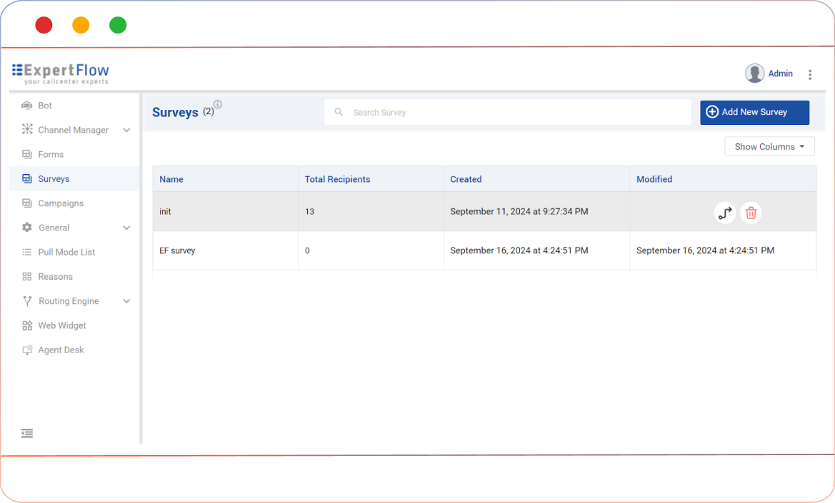Once the survey is created, it will appear in the list with details such as total recipients, creation date, and modification date. You can also select the columns you want to view from the “Show Columns” tab, on the top right corner under “Add new survey” button.