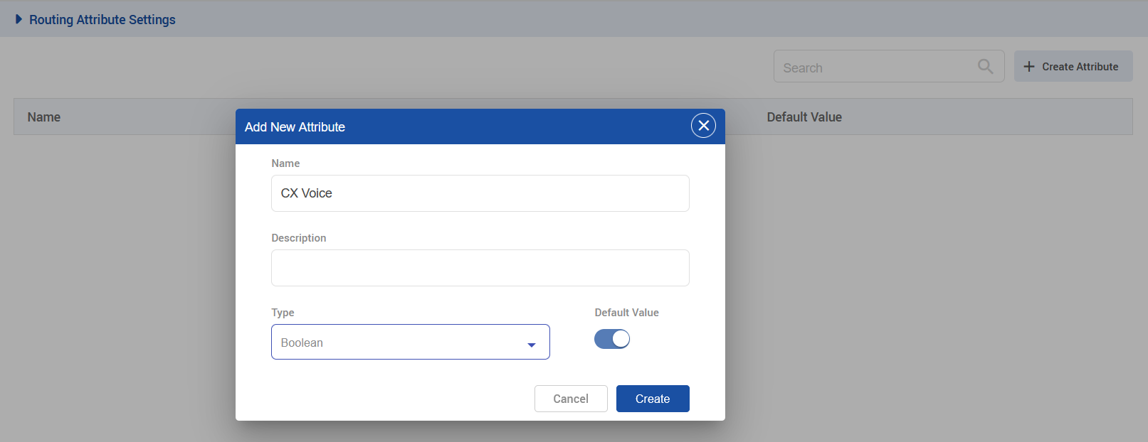 Create a Routing Attribute called CX Voice with the type of Boolean.