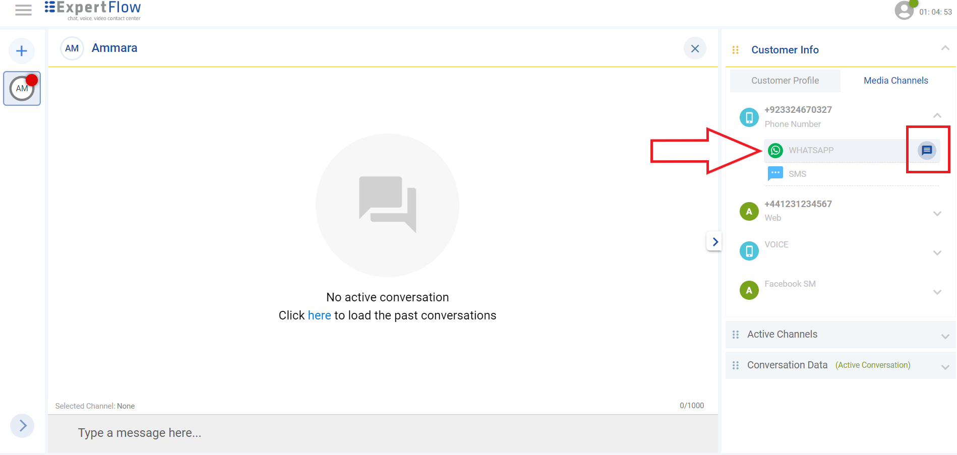 Expand the right side and click the Media Channels pane. Choose the channel identity (for now, only the phone number) for the WhatsApp channel, click the dropdown, and click the chat icon against the WhatsApp channel.