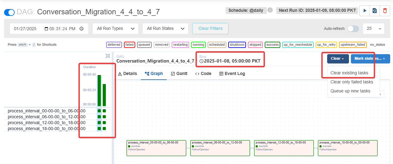 Click on the vertical bar at that time, then Clear → Clear existing tasks, this will re-run the entire instance on that date (Refer to figure 5.), refresh the tab if necessary.