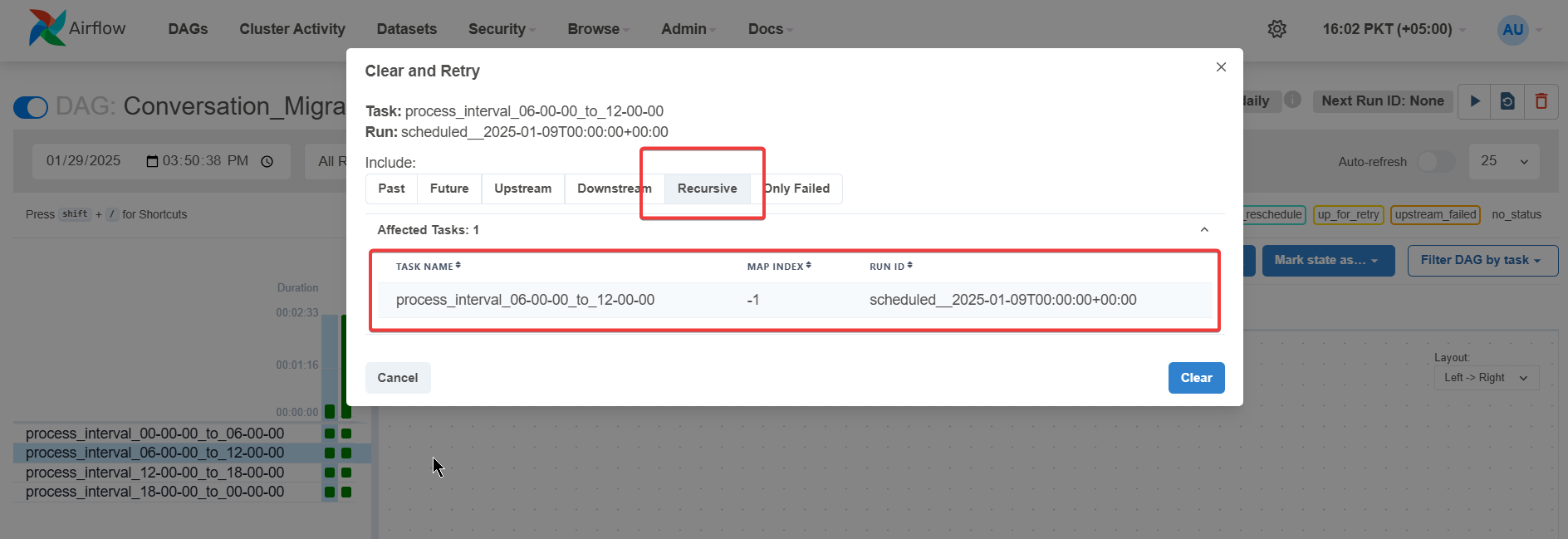 Click on the small green square (Refer to figure 3.) of that interval and select “Clear task”. This will open a new dialogue, select the “Recursive” option and then Clear (Refer to figure 4). This will clear up that task at that interval and queue it up for re-run