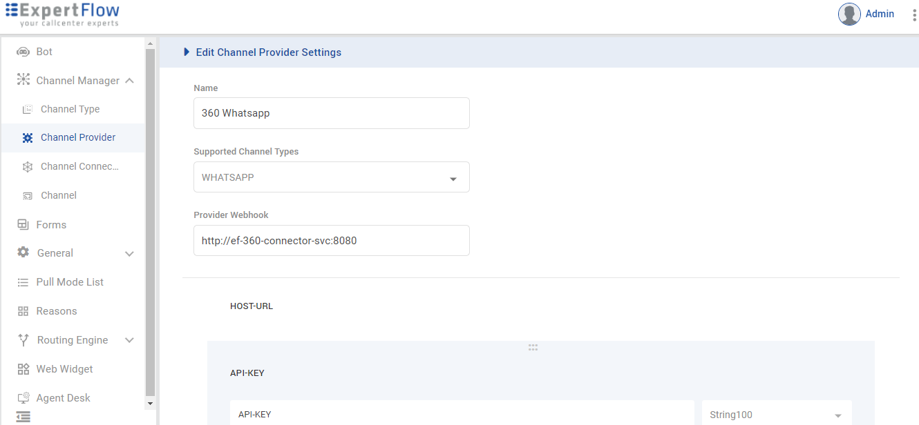 Provide the service name of 360 Connector in the Provider Webhook field as http://{SERVICE-NAME}:{SERVICE-PORT}. Replace the {SERVICE-NAME} and {SERVICE-PORT} in the URL with the component's k3s-based service name and port (It can be fetched using k get svc -n expertflow) E.g: