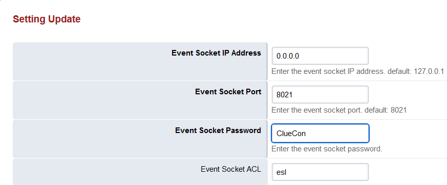 Optionally, change the Event Socket Password to the a different value, or leave as default ClueCon.
