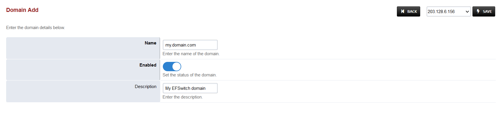 Press the IP address in the top right and select the Domain created in the Domain creation section above: