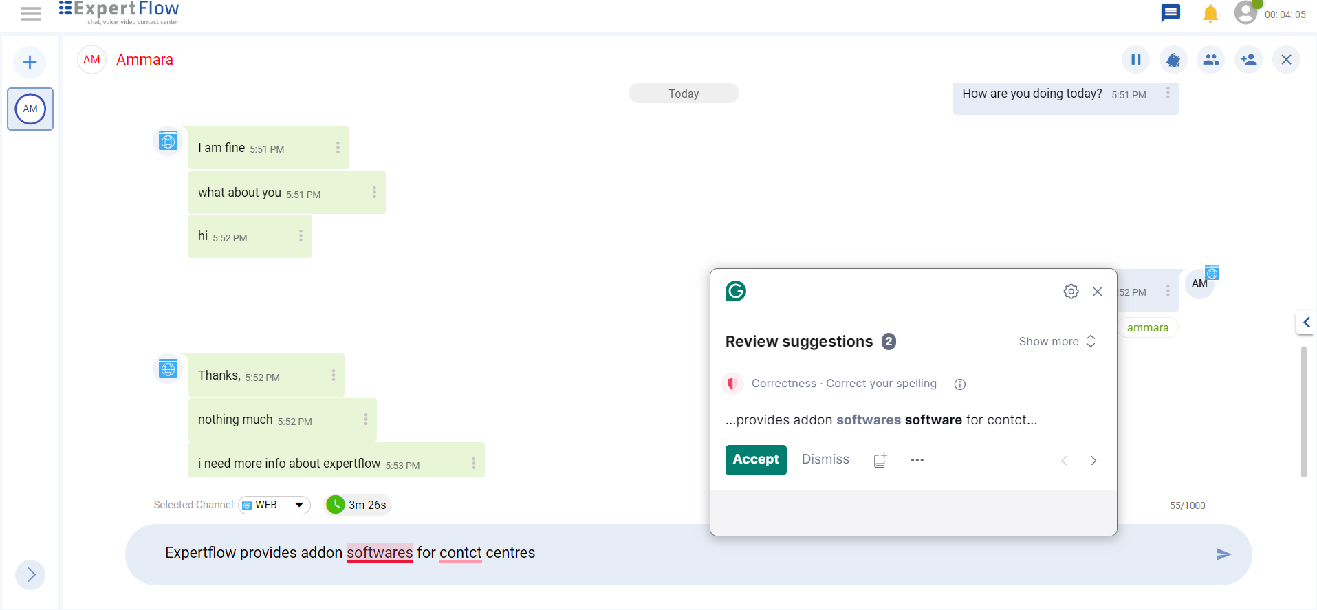 Agents can now have spell and grammar checks while typing a message. For this, the Grammarly extension needs to be installed in the browser. Once installed, they can see the Grammarly icon in the Message Composer.