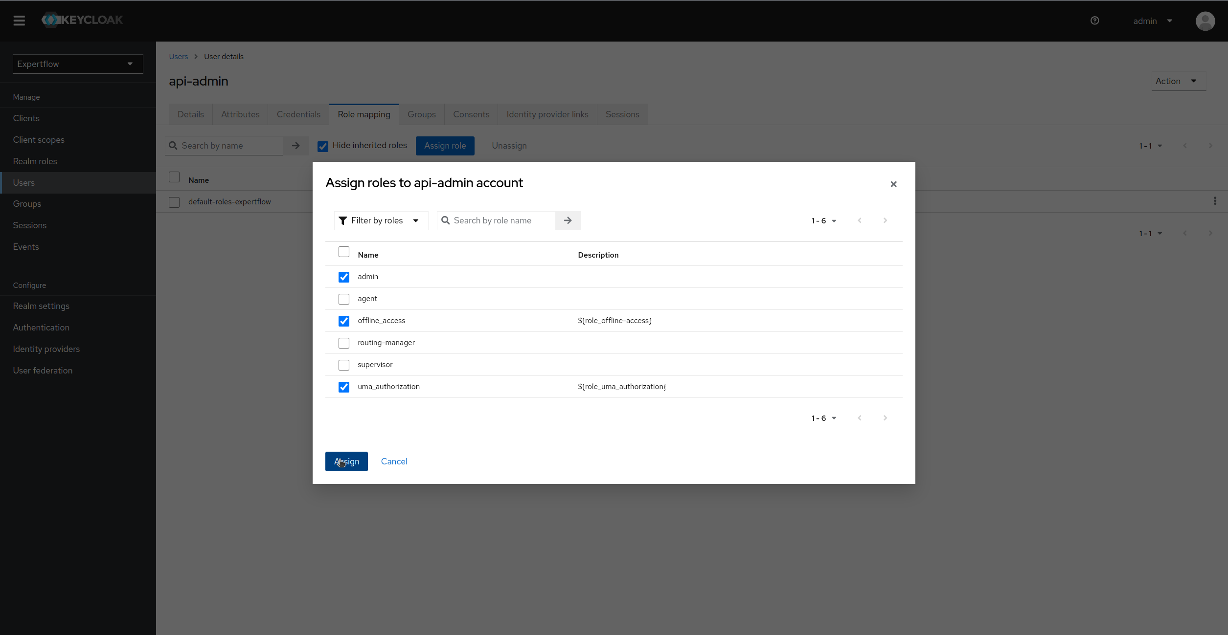 3. Assign the admin realm role along with offline-access and uma-authorization: