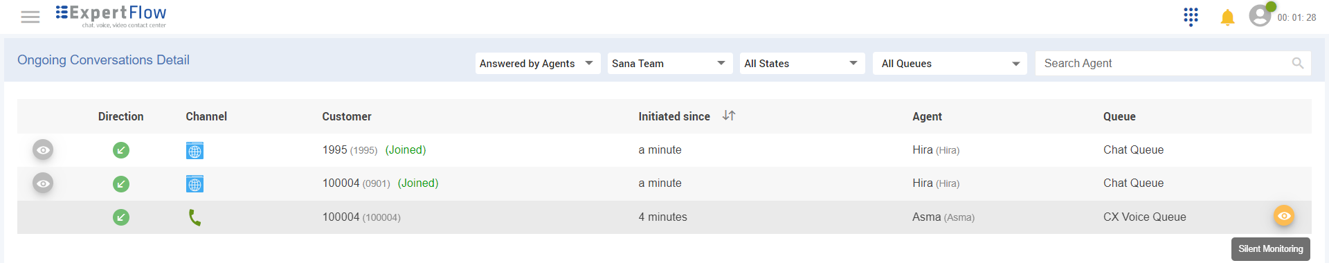 Ongoing Conversation Detail Dashboards View on Silent Monitoring