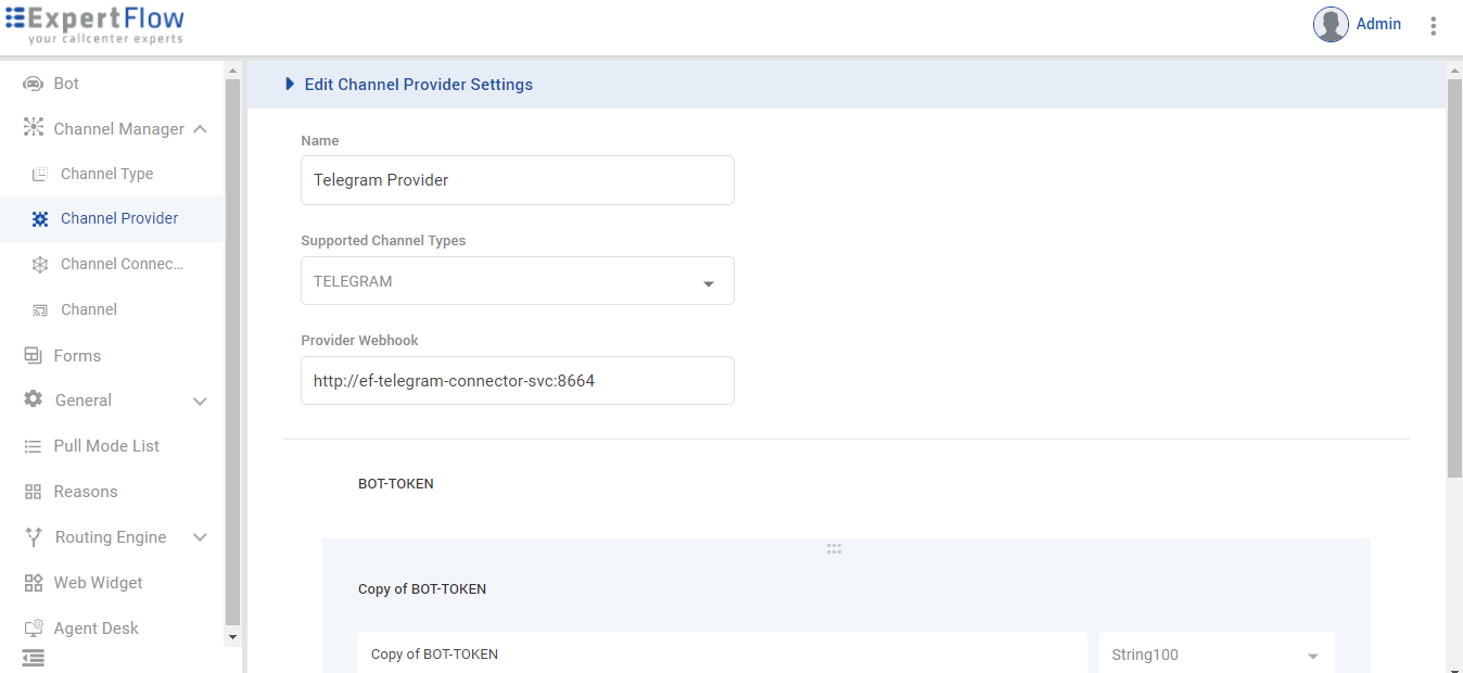 Provide the service name of Telegram Connector in the Provider Webhook field as http://{SERVICE-NAME}:{SERVICE-PORT}. Replace the {SERVICE-NAME} and {SERVICE-PORT} in the URL with the component's k3s-based service name and port (It can be fetched using k get svc -n expertflow) E.g: