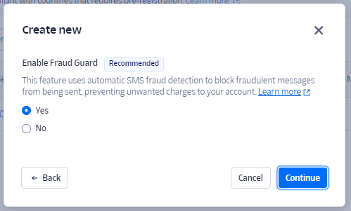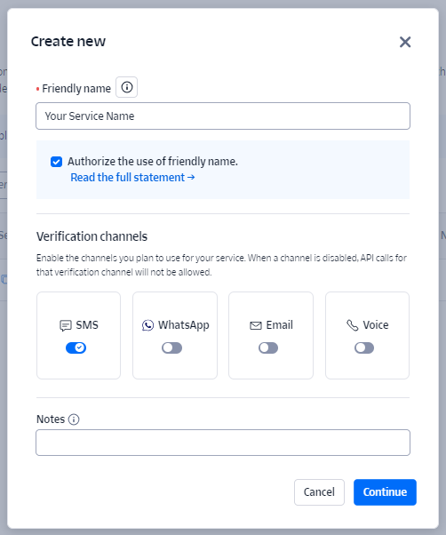 Fill in the required information, check ‘Authorize the use of friendly name’ and enable SMS channel. Add notes (description of service) if you want to and click ‘Continue’.