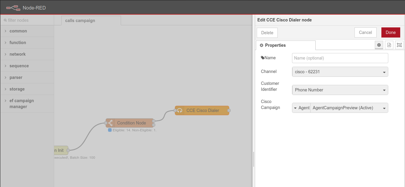 The CCE Cisco Dialer node can be used to push the contacts within current batch to a specific Cisco CCE campaign. The contacts are then dialed by Cisco CCE.