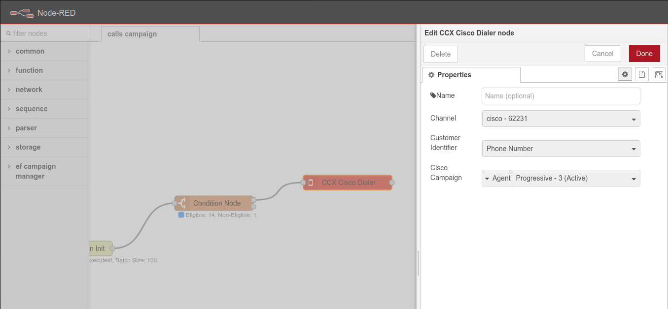 The CCX Cisco Dialer node can be used to push the contacts within current batch to a specific Cisco CCX campaign. The contacts are then dialed by Cisco CCX.