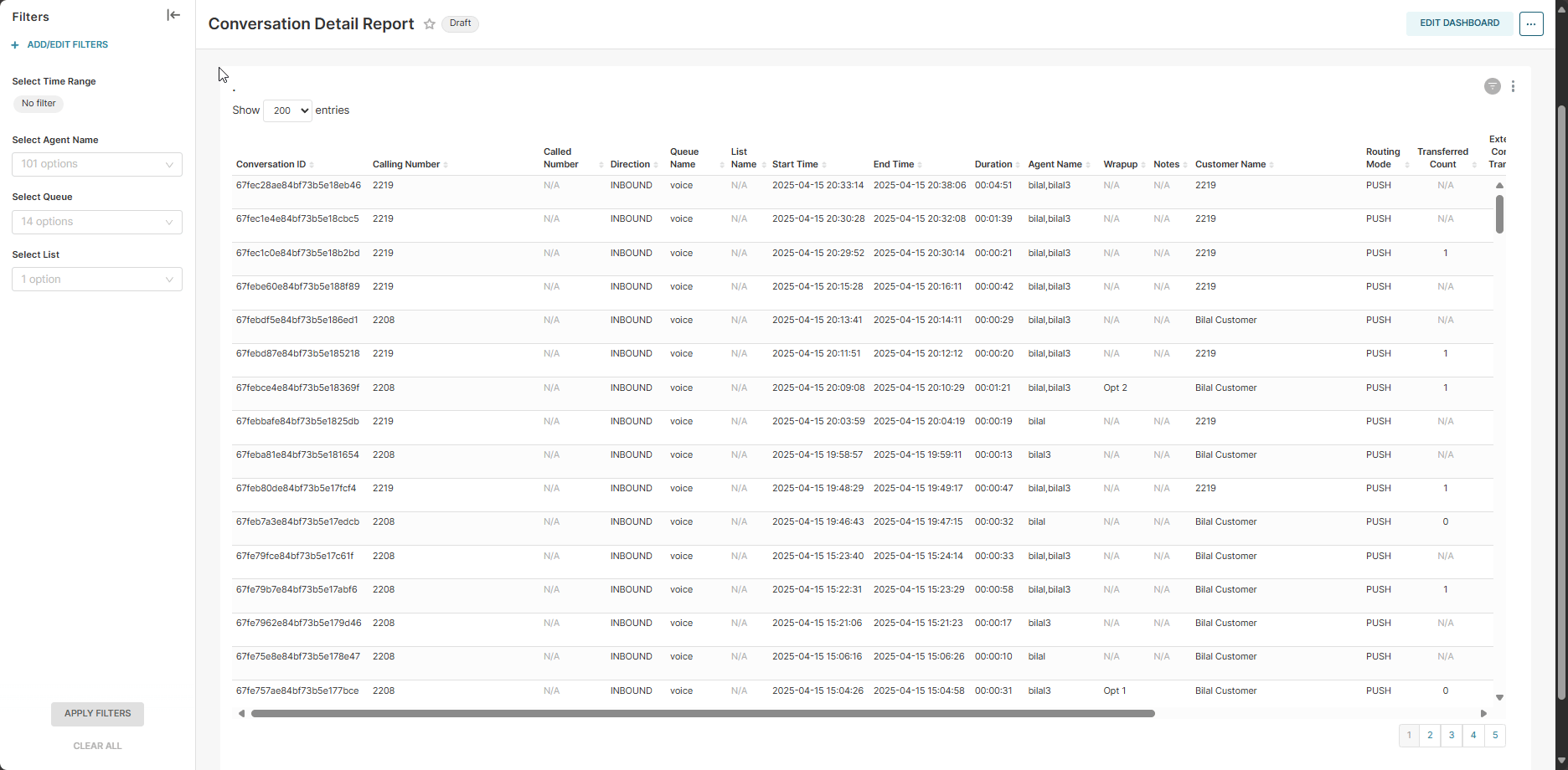 Report Summary | Provides the details of a customer conversation including a conversation's direction, queue name, list name, start time, end time, duration, agent's name, customer's name, routing mode of the conversation, internal transferred count, external transfer, percentage of agent/bot participation, transcript, and disposition. |