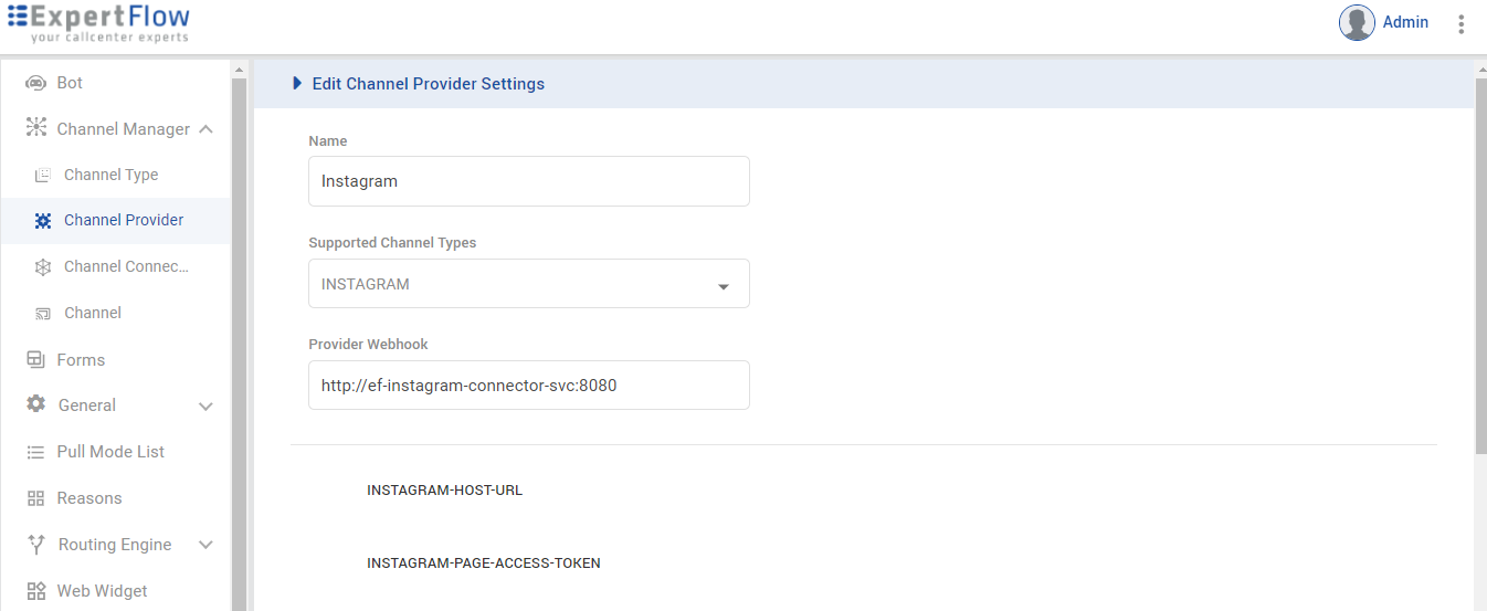 - Provide the service name of Instagram Connector in the Provider Webhook field as http://{SERVICE-NAME}:{SERVICE-PORT}. Replace the {SERVICE-NAME} and {SERVICE-PORT} in the URL with the component's k3s-based service name and port (It can be fetched using k get svc -n expertflow) E.g: