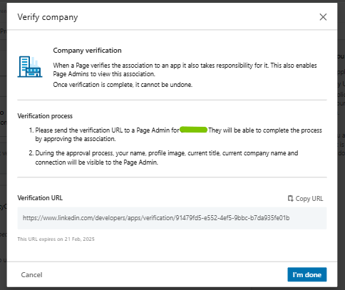 A verification link will be sent to the administrator of the associated LinkedIn Page.